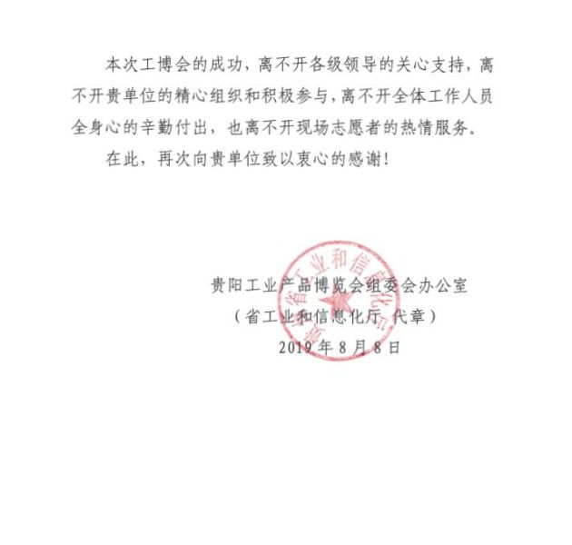 省工信廳致貴州科博展覽公司的《感謝信》